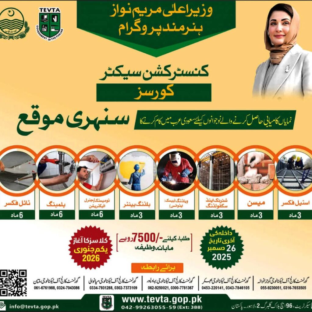 The Government of Punjab, under the visionary leadership of Chief Minister Maryam Nawaz, has launched the CM Punjab Hunarmand Program 2026, offering free skill development courses in the construction sector for the youth of Punjab.